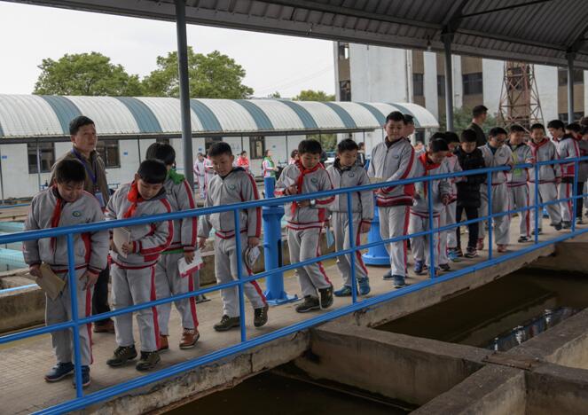 如圖沈家營(yíng)小學(xué)師生在涼亭山水廠參觀反應(yīng)池。