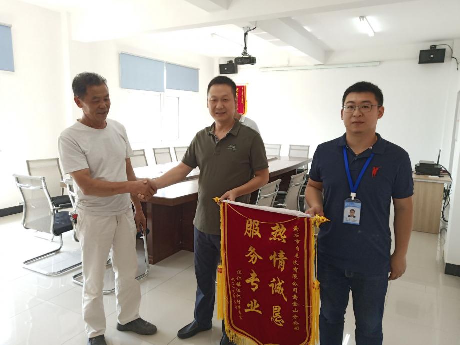 6月4日上午,汪仁鎮(zhèn)汪仁村相關(guān)負(fù)責(zé)人代表全村來到市自來水有限公司黃金山供水分公司,送來了一幅印有“服務(wù)專業(yè) 熱情誠懇”的錦旗,對他們貼心為民服務(wù)、真誠為民解憂的行為表示感謝。