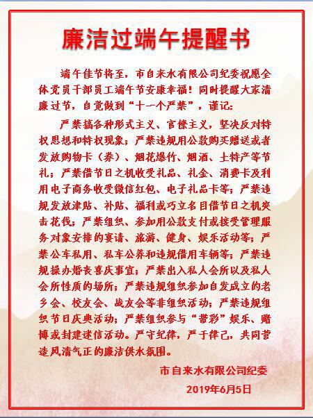 為落實城發(fā)紀委嚴明端午節(jié)期間紀律通知要求,公司紀委強化教育提醒,在微信公眾號、各工作群發(fā)布《廉潔過端午提醒書》,溫馨提醒干部職工自覺做到“十一個嚴禁”,全體紀檢人員加大督促檢查力度,開展紀律作風專項檢查,對發(fā)現(xiàn)的節(jié)日期間“四風”問題快查嚴處,凈化節(jié)日風氣。公司領(lǐng)導在安全生產(chǎn)會重申節(jié)間紀律,各黨支部多載體多渠道傳達紀律要求,及時發(fā)放《提醒書》,并組織學習了中紀委端午節(jié)前夕曝光的六起違反中央八項規(guī)定精神典型問題,切實筑牢廉潔防線,嚴防“節(jié)日腐敗”、嚴肅過節(jié)紀律,確保人人廉潔、清廉過節(jié)。
