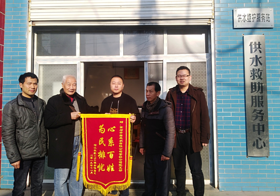 12月11日,臨江社區(qū)工作人員及居民代表一行3人來到市自來水有限公司經(jīng)營銷售公司,送來了一面寫有“心系百姓,為民解憂”的錦旗,感謝經(jīng)營銷售公司黨支部關(guān)心居民用水困難,為社區(qū)居民解決用水難題。