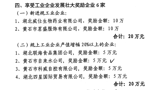 4月15日,市自來(lái)水有限公司獲得黃石港區(qū)人民政府發(fā)放的工業(yè)企業(yè)發(fā)展壯大獎(jiǎng)金5萬(wàn)元整,以獎(jiǎng)勵(lì)該公司作為規(guī)上企業(yè)在2019年度產(chǎn)值增幅達(dá)到20%以上的成績(jī),黃石港區(qū)共有4家單位獲此榮譽(yù)。