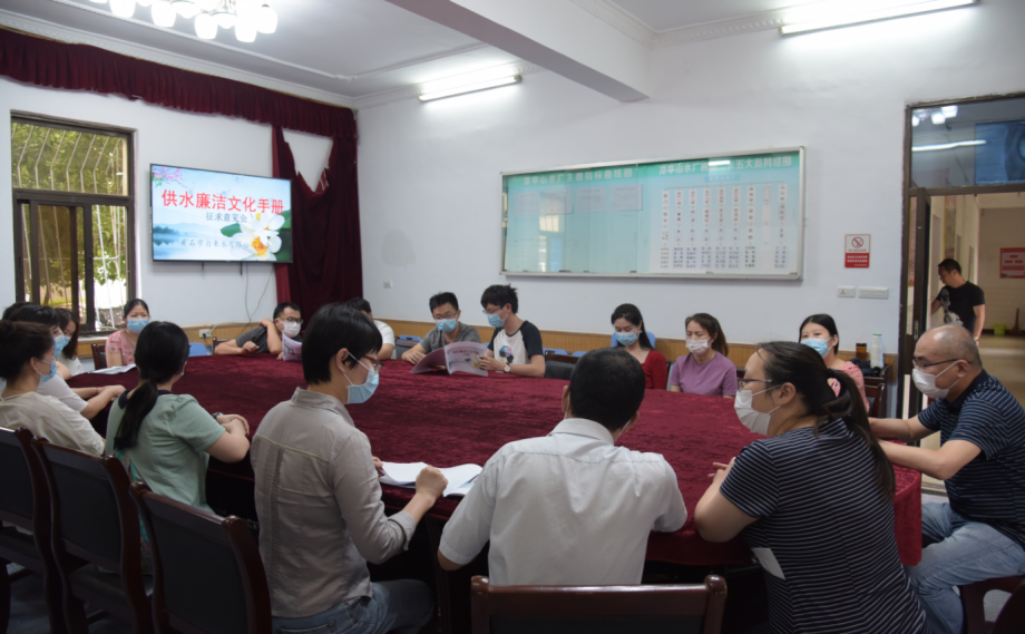 為縱深推進(jìn)國(guó)有企業(yè)“十進(jìn)十建”活動(dòng),爭(zhēng)創(chuàng)法紀(jì)宣教建設(shè)示范陣地,打造“廉潔供水”品牌。公司紀(jì)委組織編寫(xiě)的《供水廉潔文化手冊(cè)》經(jīng)廣泛征求員工意見(jiàn),起于認(rèn)同、成于規(guī)范,已定初稿。該《手冊(cè)》理念行為識(shí)別系統(tǒng)確定了供水廉潔核心理念,規(guī)范了各崗位廉潔從業(yè)、優(yōu)質(zhì)服務(wù)行為,為安全生產(chǎn)、優(yōu)質(zhì)供水、服務(wù)社會(huì)奠定了政治基礎(chǔ)和紀(jì)律保障。圖為公司廉潔優(yōu)質(zhì)服務(wù)示范區(qū)·涼亭山水廠召開(kāi)《供水廉潔文化手冊(cè)》征求意見(jiàn)會(huì),干部職工正在提出修改建議。
