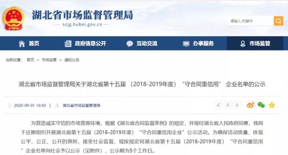 為營(yíng)造誠實(shí)守信的市場(chǎng)營(yíng)商環(huán)境,今年,省市場(chǎng)監(jiān)督管理局組織開展了湖北省第十五屆(2018-2019年度)守合同重信用企業(yè)評(píng)選活動(dòng),并進(jìn)行了名單公示。