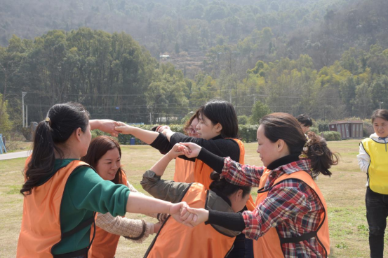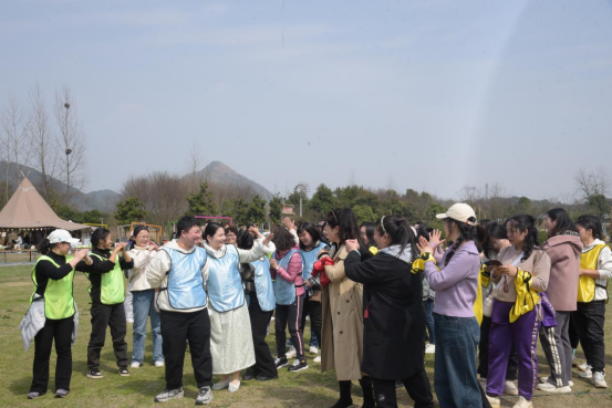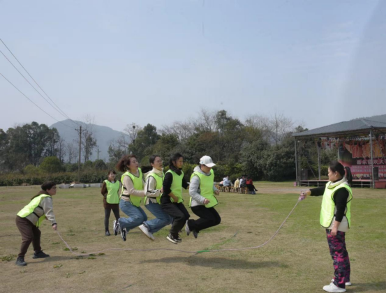 緊接著,女職工們?cè)谌嗉绱繁场⒒ㄩ_(kāi)花落等熱身破冰運(yùn)動(dòng)后,組成5隊(duì)進(jìn)行PK,團(tuán)建趣味活動(dòng)內(nèi)容豐富多彩,既有跳大繩等傳統(tǒng)的體育項(xiàng)目,也有考驗(yàn)團(tuán)隊(duì)默契配合的“解手鏈”,還有考驗(yàn)智慧的“算二十四點(diǎn)”。隊(duì)員們情緒高漲,各顯神通,使出渾身解數(shù)。整個(gè)賽場(chǎng)熱鬧非凡,口號(hào)聲、加油聲、吶喊聲、歡笑聲不絕于耳。