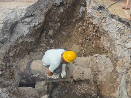 而與此同時(shí),20多公里外,廣州路DN600供水管道遷改項(xiàng)目施工現(xiàn)場(chǎng)。工人們正在清理溝槽、焊割工對(duì)施工的管件進(jìn)行切割。。。。。。各工序正有條不紊的推進(jìn)。