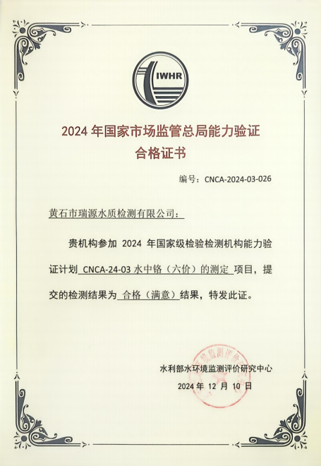 水質(zhì)檢驗(yàn)?zāi)芰︱?yàn)證是有效提高實(shí)驗(yàn)室能力的重要手段,近期生產(chǎn)運(yùn)行中心(瑞源水質(zhì)檢測(cè)公司)參加2024年國(guó)家級(jí)能力驗(yàn)證計(jì)劃“水中鉻(六價(jià))的測(cè)定”國(guó)家級(jí)能力驗(yàn)證項(xiàng)目,順利通過水利部水環(huán)境監(jiān)測(cè)評(píng)價(jià)研究中心考核,評(píng)價(jià)結(jié)果為合格(滿意)。
