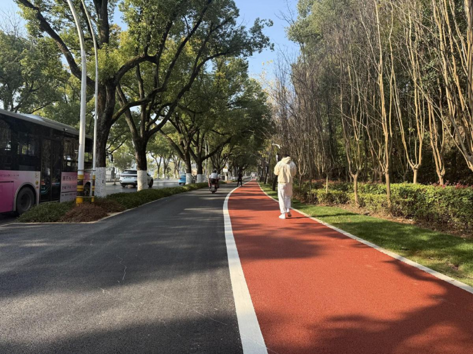 當日上午,記者在現(xiàn)場感受到,新鋪設的彩色瀝青人行道視覺上給人以清新、舒適的感受,杭州東路在彩色綠道的映襯下顯得更加美麗。不少市民紛紛表示,新鋪設的彩色瀝青路面好似一條蜿蜒的綠色綢帶,呈現(xiàn)出一幅充滿生機與活力的畫卷。