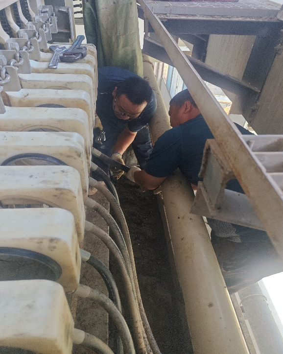 緊急搶修中,維修團隊更顯擔當?;êS板框機濾布沖洗管更換,維修人員毫不猶豫鉆進設備狹窄空間,汗水如雨仍爭分奪秒,高效完成舊管拆卸與新件安裝;下陸DN1200閘門維修恰逢正午烈日,大家頂著高溫默契配合,順利完成作業(yè)。