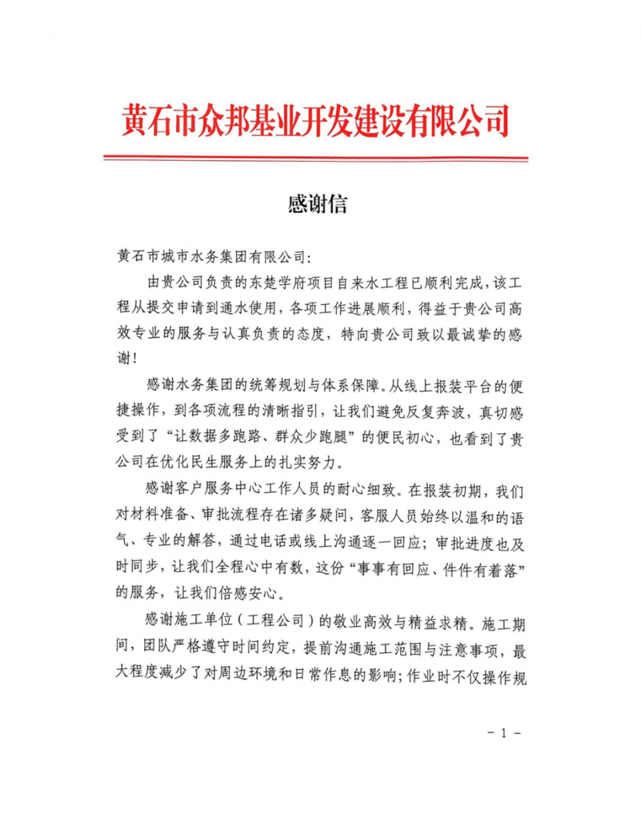 近日,市水務(wù)集團(tuán)收到了眾邦基業(yè)開發(fā)公司發(fā)來的感謝信,字里行間滿是對(duì)東楚學(xué)府報(bào)裝接水項(xiàng)目工作的認(rèn)可與贊譽(yù)。這份真摯的感謝,不僅是對(duì)水務(wù)集團(tuán)工作的肯定,更是水務(wù)集團(tuán)踐行兩會(huì)精神、深耕民生服務(wù)、優(yōu)化營(yíng)商環(huán)境的生動(dòng)縮影。